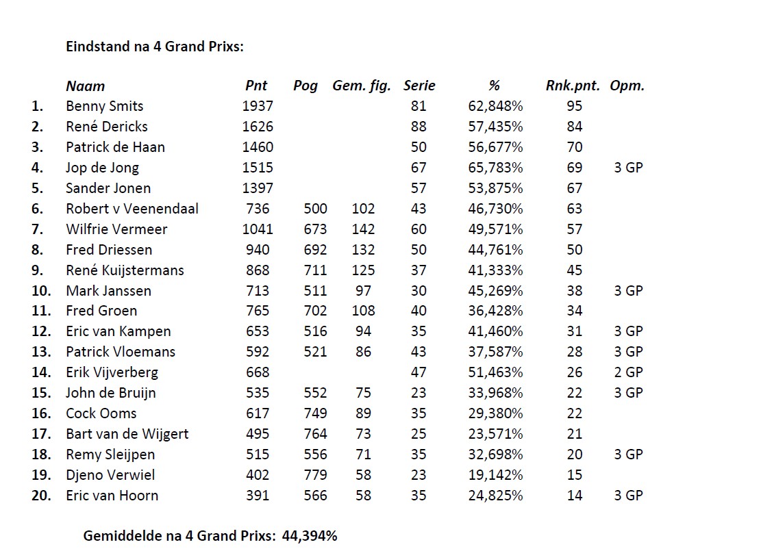 Nadat iedereen 50 figuren gespeeld had, kon een tussenstand worden opgemaakt waarbij het deelnemersveld gesplitst werd. De nummers 5 en volgende zouden op zondag nog 20 figuren spelen en de top-4 zou via halve finales en finale uitmaken wie deze GP zou gaan winnen. Wilfrie Vermeer, vijfde in de tussenstand, kwam maar een paar punten te kort om zich te plaatsen bij de beste 4. Hij had 191 punten verzameld en Patrick de Haan 198. Vlak boven Patrick kwam Robert van Veenendaal uit op 200 punten en Sander Jonen op 202. Ver daarboven eindigde Benny Smits met 227 punten als eerste speler in deze tussenstand.