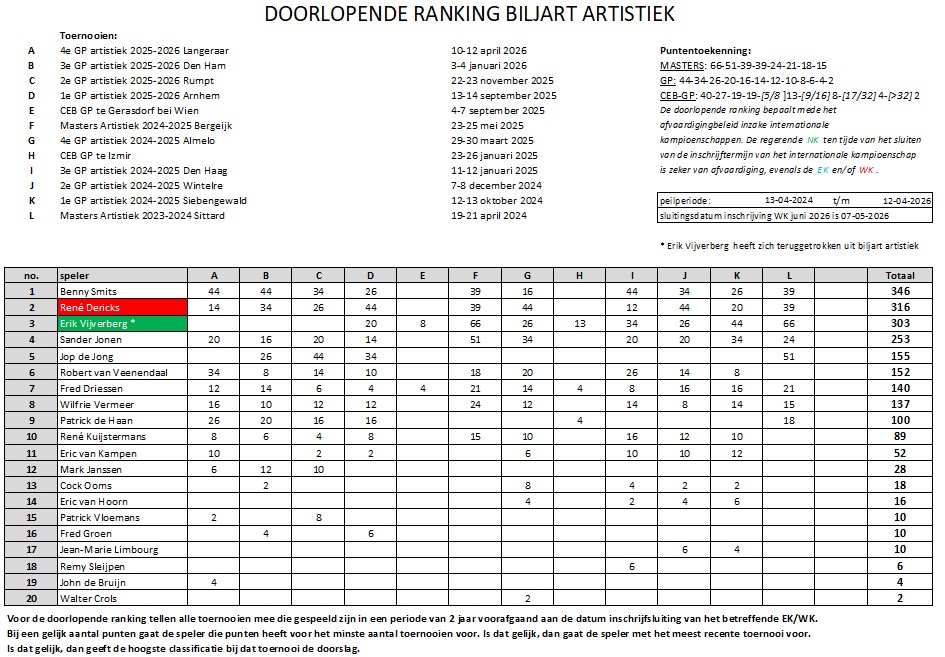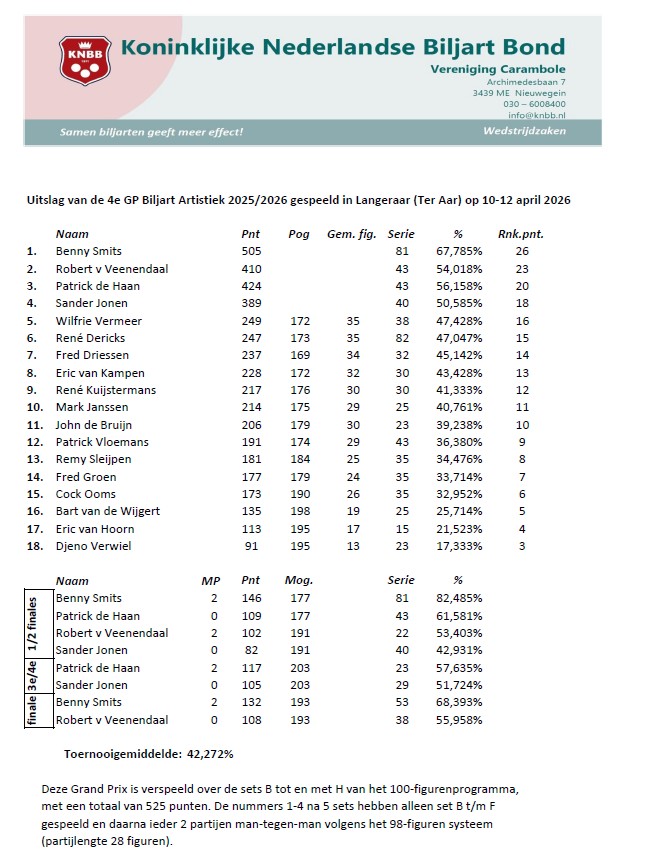 LANGELAAR - Van de 20 artistiekspelers namen er 18 deel aan deze GP. Jop de Jong had zich kort voor de GP afgemeld wegens ziekte en Erik Vijverberg moest wegens een slepende schouderblessure ook bij deze GP verstek laten gaan. Hij zal in ieder geval de rest van dit seizoen niet meer in actie komen bij het biljart artistiek.