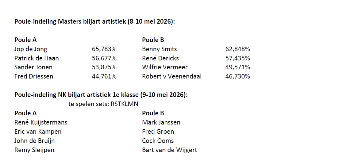 Voor de Masters biljart artistiek, die gehouden wordt in De Veemarkt in Doetinchem, vanaf vrijdagmiddag 8 mei 5 uur tot en met zondag 10 mei, hebben zich geplaatst: Jop de Jong, Benny Smits, René Dericks, Patrick de Haan, Sander Jonen, Wilfrie Vermeer, Robert van Veenendaal en Fred Driessen.