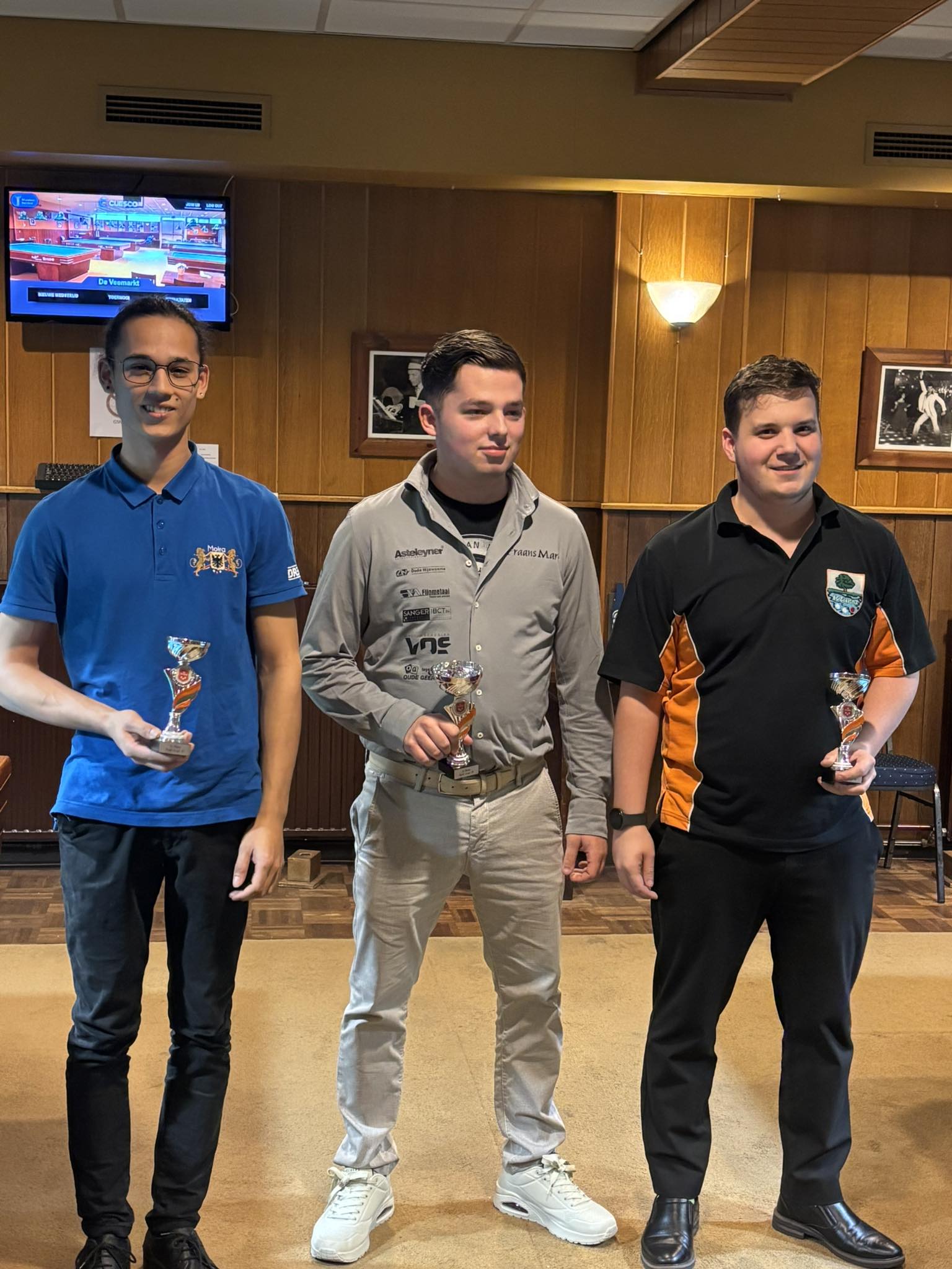 En we hadden in de Veemarkt een prachtig podium: op 3 Sean van Buren met 7 punten en een carambolepercentage van 88,81%, op 2 Bart van der Valk 7 punten en 92,3%, en op 1 met 7 punten en 98,52% de winnaar van deze derde Grand Prix: Leroy Wijnhoud.