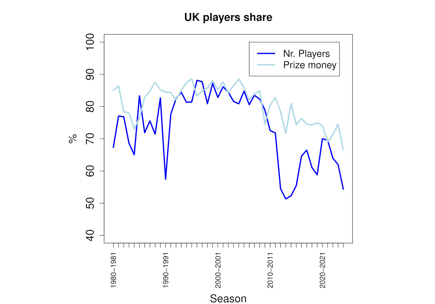 The website CueTracker provides a wealth of snooker statistics, including seasonal prize money rankings. From these rankings it can be calculated what percentage of the players is from the UK, and the share of the available prize money they earned. The image below shows the results of these calculations for 45 seasons, from the 1980-81 season to the 2024-25 season. The dark blue line represents the percentage of UK players in the prize money ranking in a given season. The light blue line represents the share of the total amount of prize money in a given season that was earned by these UK players together.
