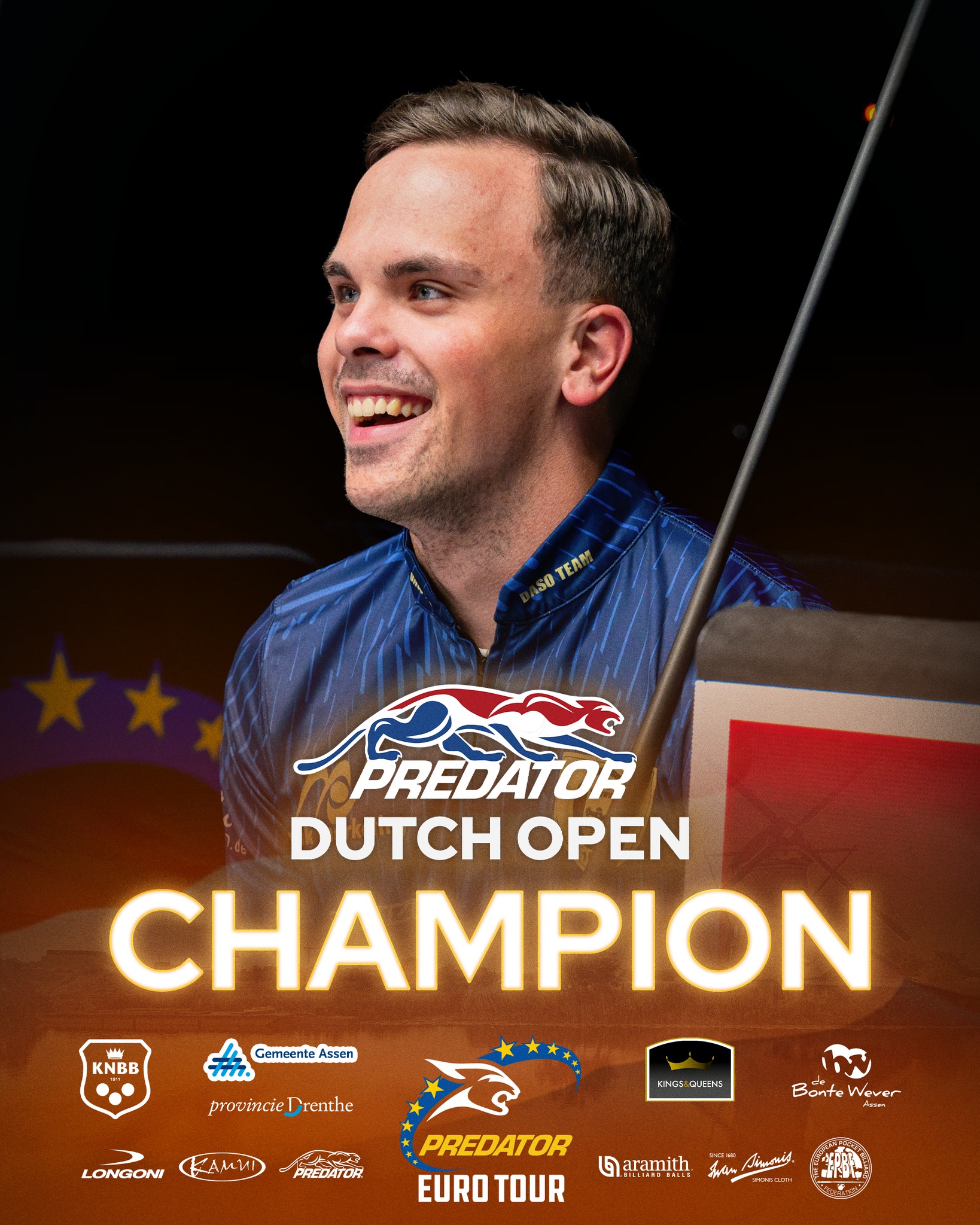 De kampioen van de Predator Eurotour Dutch Open 2025, voor het eerst in De Bonte Wever in Assen, heet Dominik Jastrzab uit Polen. Knap teruggekomen in de finale tegen de Duitse, in Nederland bij Sonny’s Billiard Supplies spelende, Tobias Bongers, boog de pas 20-jarige Dominik een 4-0 achterstand om naar een 11-9 overwinning.
