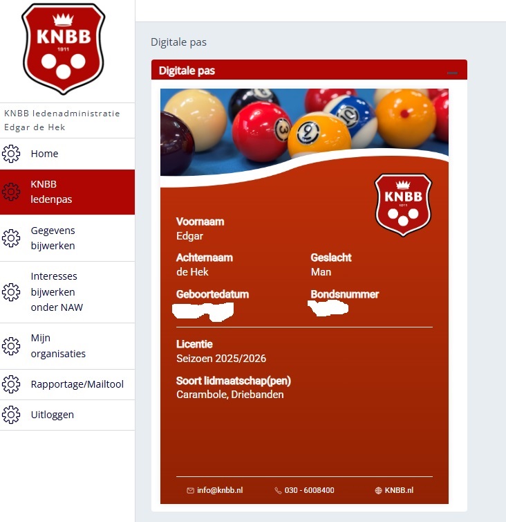 Deze ledenpas is voor ieder KNBB-lid gratis beschikbaar op https://www.mijnknbb.nl/. Als u bent ingelogd, ziet u dit: