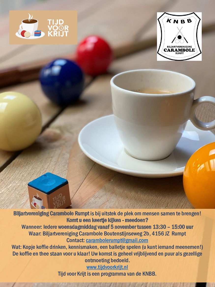 U kunt aanwezig zijn bij de feestelijke start bij Biljartvereniging Carambole op woensdagmiddag 5 november van 13:30 - 15:00 uur, waar de KNBB Tijd voor Krijt in Rumpt officieel zal openen. Toegang is gratis. Gelieve vooraf aanmelden bij de contactpersoon van Biljartvereniging Carambole: Bertus van den Dikkenberg. Gewoon binnen lopen mag en kan ook!