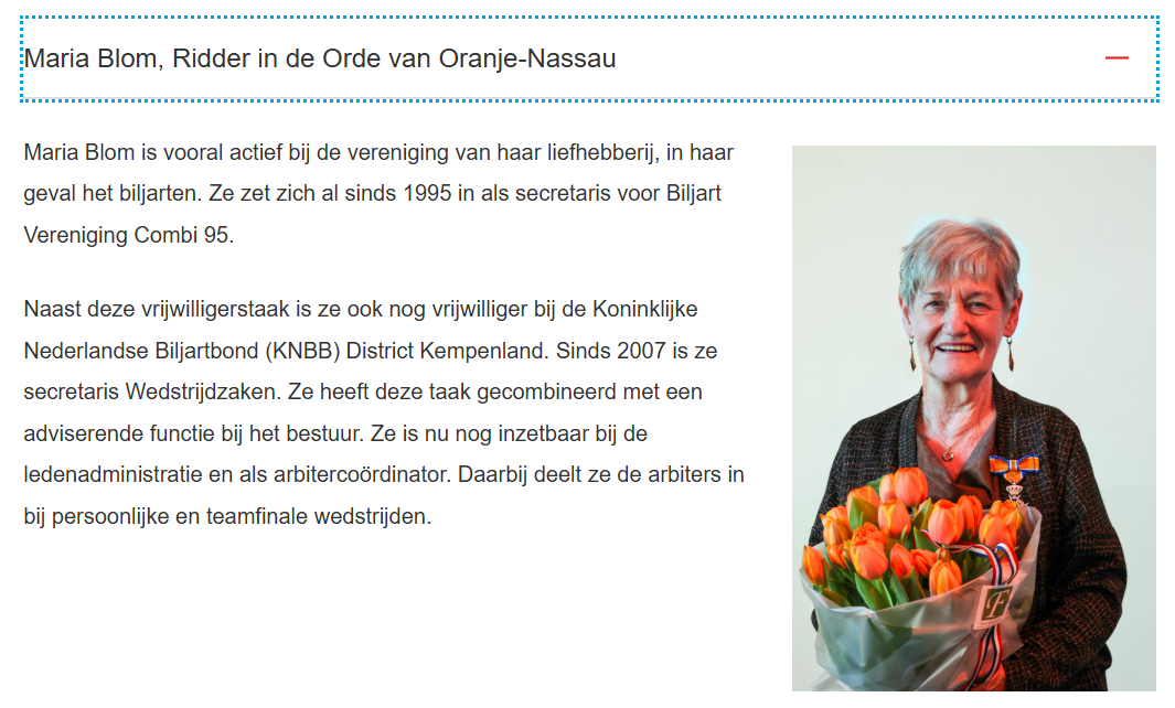 Ieder jaar zijn er wel een aantal ‘biljartlintjes’, onderscheidingen voor mensen die zich vrijwillig hebben ingezet voor onze biljartsport. Dit jaar was het wederom een mooie oogst: Marcel van Bruggen en Wieger Dijkstra Lid, Maria Blom Ridder in de Orde van Oranje Nassau. Een overzicht