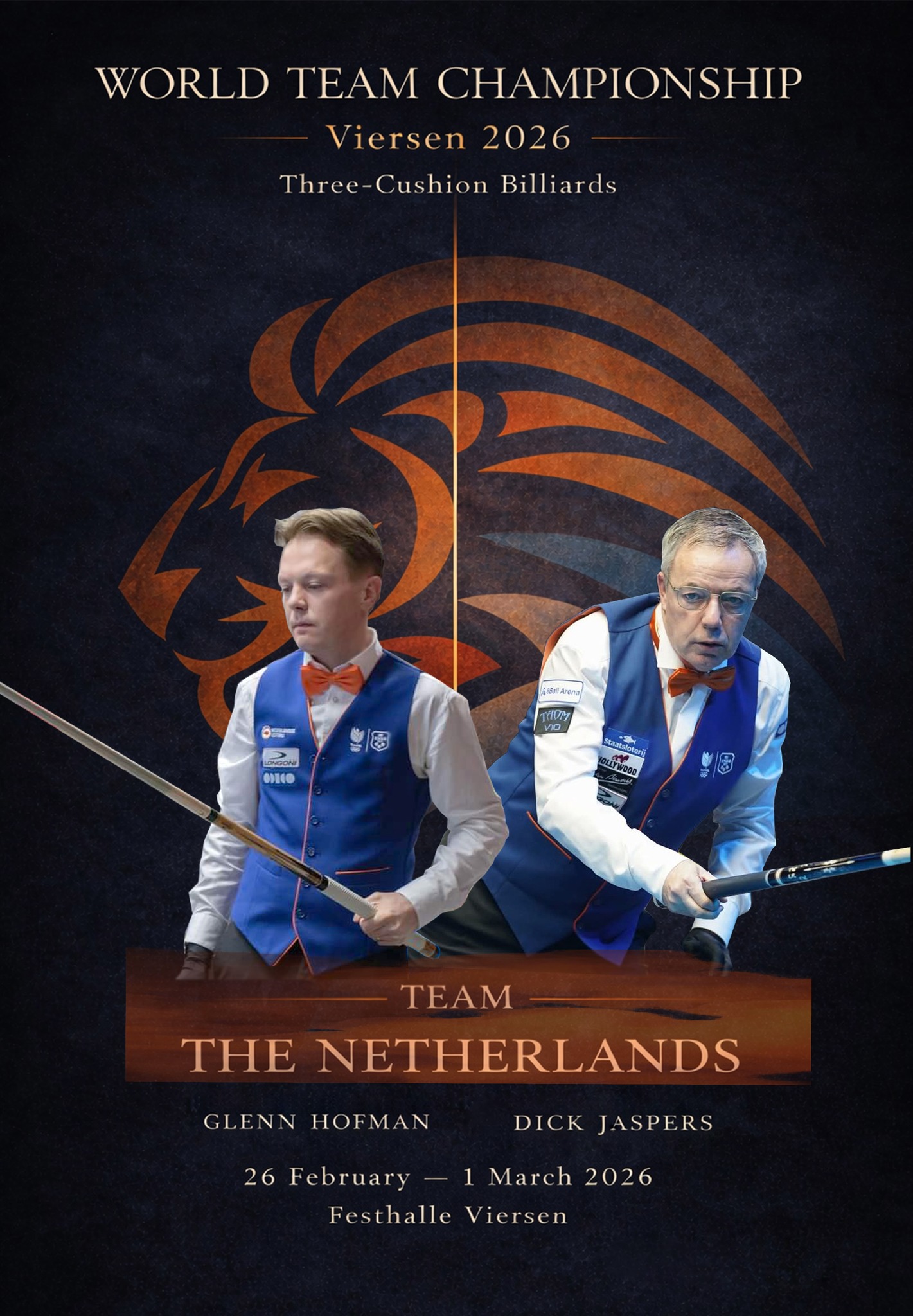 Het Nederlands team, dat speelt met Dick Jaspers en Glenn Hofman, is namens TeamNL de titelverdediger op het WK driebanden voor landenteams dat van donderdag 26 februari tot en met zondag 1 maart wordt gespeeld in Viersen. Het deelnemersveld bestaat uit routiniers en debutanten. Voor Nederland maakt Glenn Hofman zijn debuut.