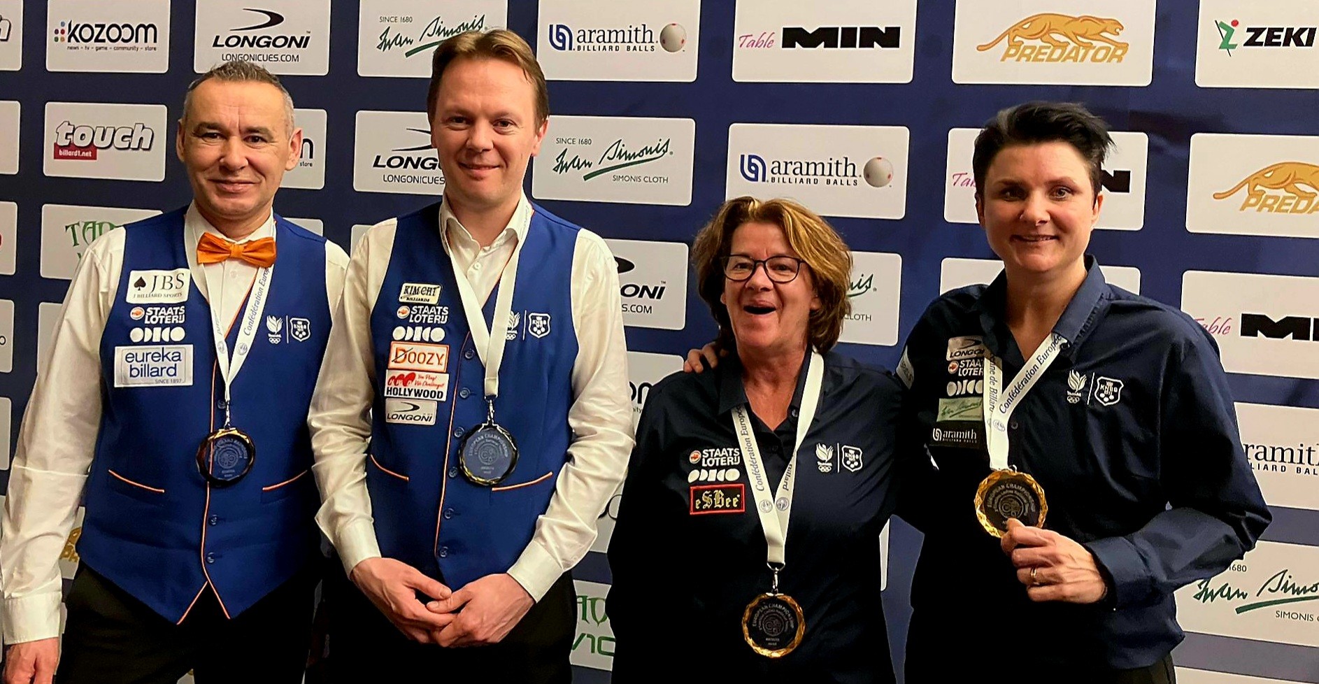 Therese Klompenhouwer en Karina Jetten sloten het Europees kampioenschap biljarten deze zondag af met een gouden medaille in het teamkampioenschap voor dames. De Nederlanders met Glenn Hofman en Jean van Erp bij de mannen wonnen brons bij de mannen, waar Frankrijk kampioen werd in de finale tegen de Belgen Frédéric Caudron, de wereldkampioen, en Peter Ceulemans, de Europees kampioen. Het overzicht in dit artikel.