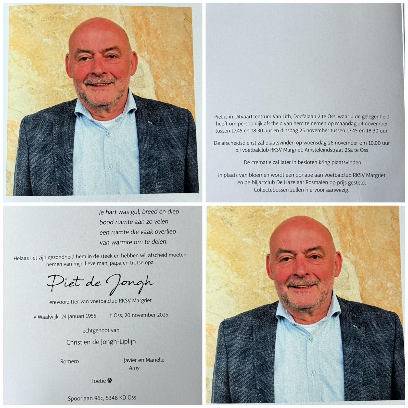 Een zeer verdrietig bericht. Op donderdag 20 november 2025 is overleden in Oss de binnen de biljartwereld uiterst geliefde Piet de Jongh. Piet werd 70 jaar.