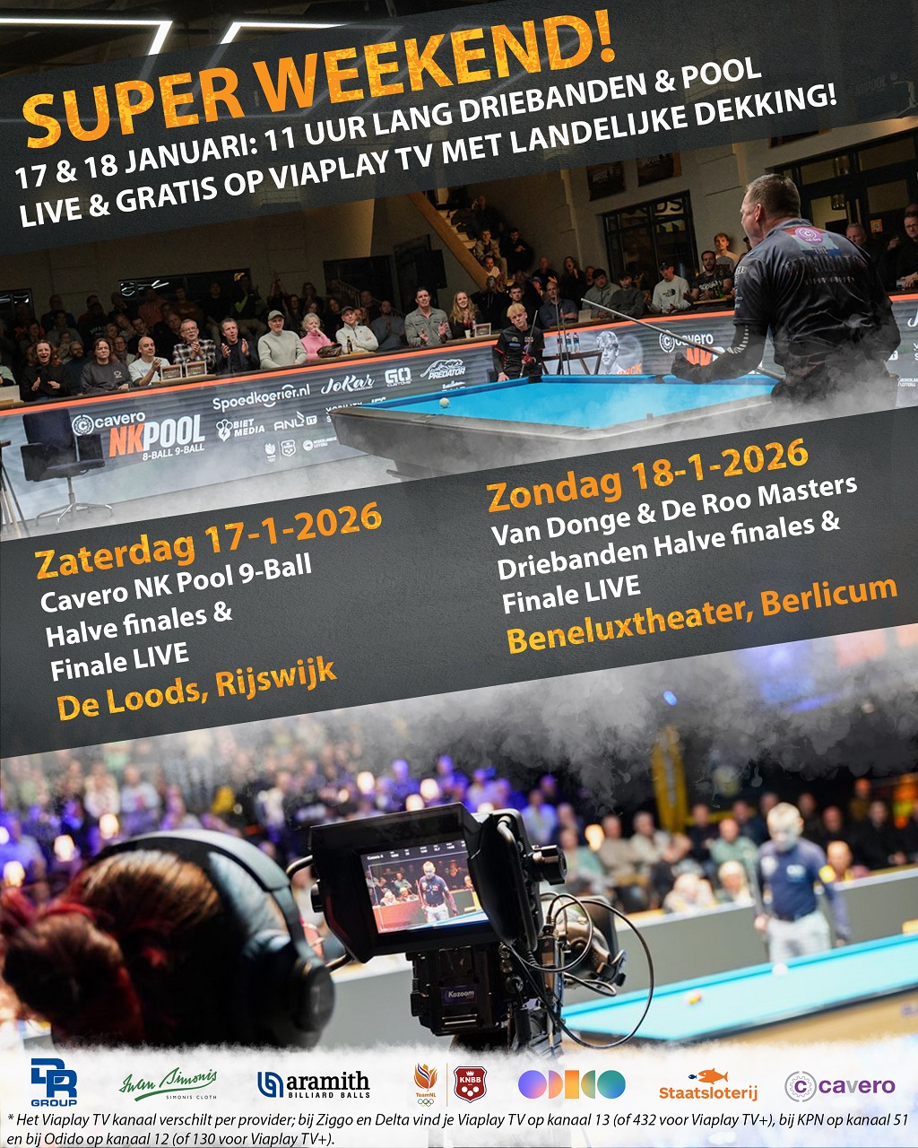 “Sinds enige tijd werken wij zeer plezierig samen met Viaplay, en het weekend van 17 en 18 januari 2026 is het voorlopige hoogtepunt van deze samenwerking. Ditmaal zijn niet alleen de finales van het Cavero NK Pool en de Van Donge & De Roo NK Masters Driebanden live te zien op het open net van Viaplay TV, maar ook de halve finales van beide events. Kortom, de volledige slotdag van het jaarlijkse hoogtepunt van het pool en dan het driebanden, alles in één weekend, live te zien dus voor iedereen in Nederland.* Met recht een superweekend – een unicum voor het Nederlandse biljart en pool.”