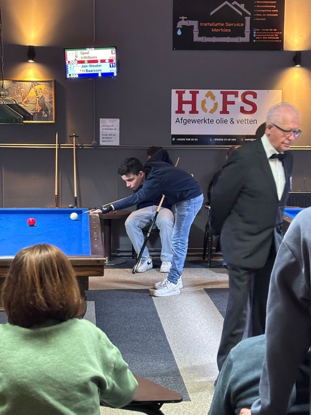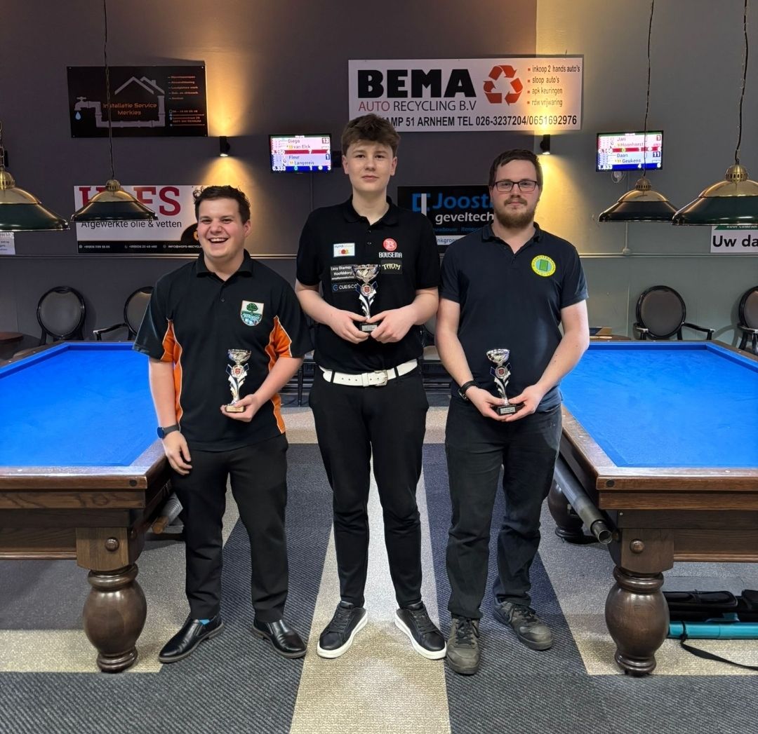 vonden de leden van de Jeugdcommissie die coaching als specialiteit hebben. Hij biljart nog maar 5 maanden en deed voor het eerst mee in deze vierde Jeugd GP. Dex Veldman behaalde 6 setpunten met een carambolepercentage van 83,333 en een moyennepercentage van 156,9. Deze cijfers waren niet de reden voor het opvallen maar het was zijn benadering van het spel, zijn concentratie, zijn afstoot, zijn tempo, kortom alles behalve het çijfermatig resultaat viel de commissie leden in positieve zin op.